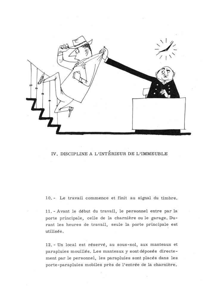 « Pendant les heures de travail et les pauses, le personnel ne sort pas de l’immeuble sans la permission du chef de service ou de son remplaçant. »